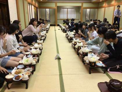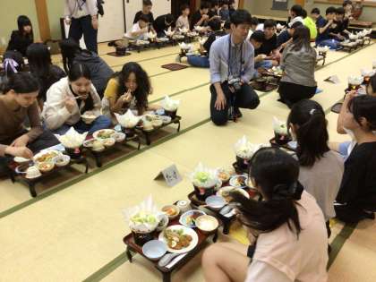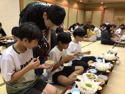 楽しく会食をしています。友達と楽しい思い出の1つになりますね。さらに食後にはコーヒー牛乳とシュークリームも配られて大喜びでした。