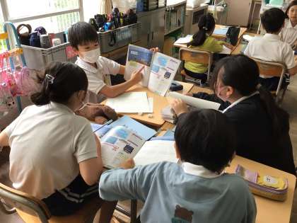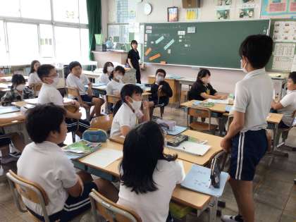 日本の水産業の学習です。かつお漁を例に「一本釣り」と「まきあみ漁」を比べて、それぞれのよさや工夫を考えました。友達の発言を聞いて「どうしてそう思ったの?」「どうやって?」などともっと詳しく聞こうとする姿が素敵でした。