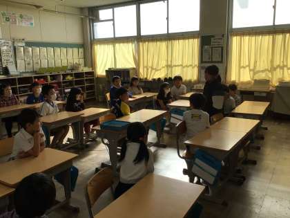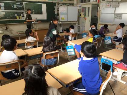 友だちの意見をしっかり聞いています。国際学級でも実際の入れ物を使ってかさの学習をしました。