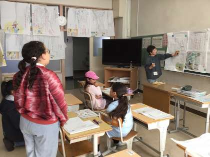 4年生国語の国際学級では、「一つの花」の学習をしています。今日は、登場人物のゆみこが、どんな子になったか考え、発表しました。