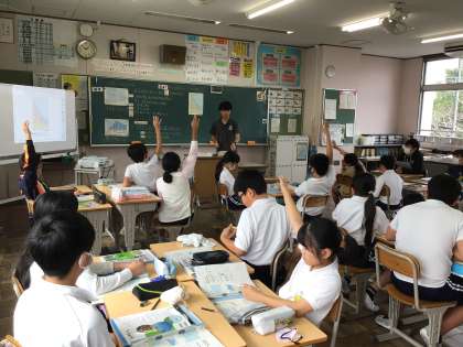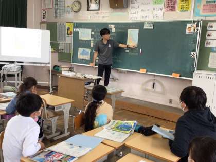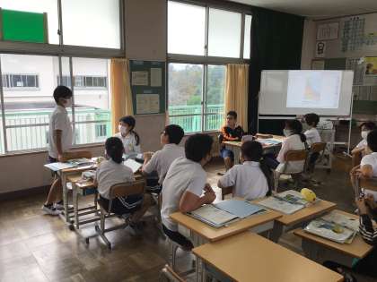 5年社会では水産物の盛んな地域について学んでいます。「なぜ水産量が減っているか調べよう」というめあてで学習を進めていました。班で資料にあるグラフからわかること、気づいたことについて話し合った後、発表していました。