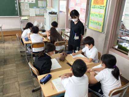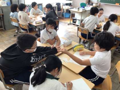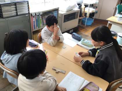 5年算数では、約分について復習を行った後、3分の5と5分の3はどちらが大きいのか班で話し合っていました。