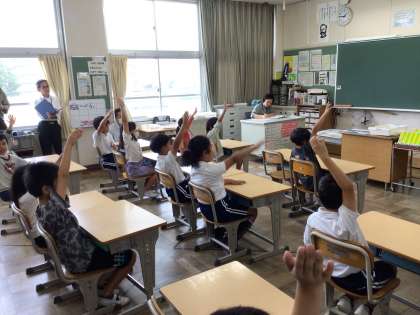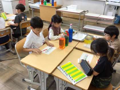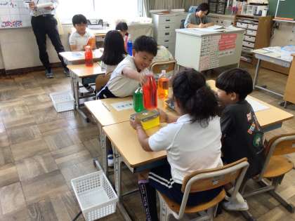 10/23 2年生算数1 公開日 2024/10/23 更新日 2024/10/23 各学年から 今日の2年生算数「かさ」の学習は、たくさんの先生方に見ていただきました。入れ物の違う魔法の水でどの入れ物の水が多いかを予想して、比べました。予想と違い、全部同じ水のかさで、子どもたちはびっくりしていました。次の授業も楽しみですね。