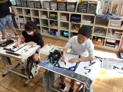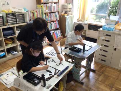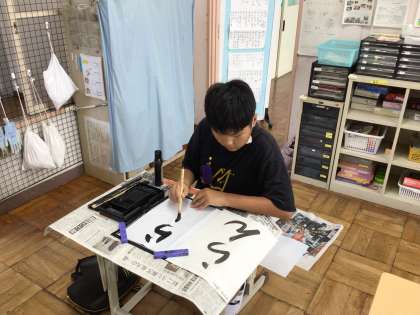 10/24 7・8組書写 公開日 2024/10/24 更新日 2024/10/24 各学年から 7・8組書写では、「らん」を書きました。2文字なので半紙を折ってバランスよく書くことができるように準備しました。筆使いが難しいお題です。来週も練習する予定です。