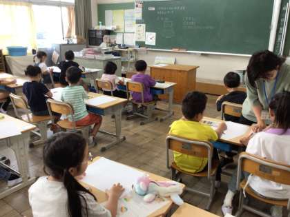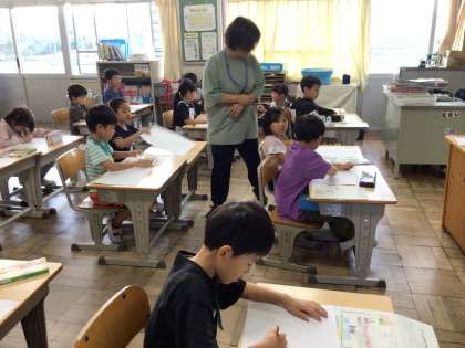1年生の図工では、読書感想画の練習をしました。下書きしたプリントの絵を見ながら、画用紙にクレヨンを使って描いてみました。