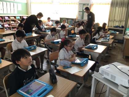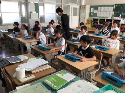 タブレットを使ってプログラミングの学習をしました。ICT支援員さんにもお力を借りて、魚の動きを自分で組み立てました。自分が入力した通りに動く魚を見て、うれしそうな表情の子どもたちでした。
