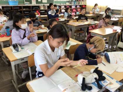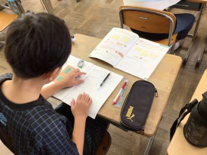 10/25 4年生算数 公開日 2024/10/25 更新日 2024/10/25 各学年から 面積の学習です。先生から1平方センチメートルの紙をもらうと、「小さい」と驚く声が聞こえました。子どもたちは、1平方センチメートルの紙を指にのせたり、ノートのマス目と重ねたりしながら、その大きさを確認していました。