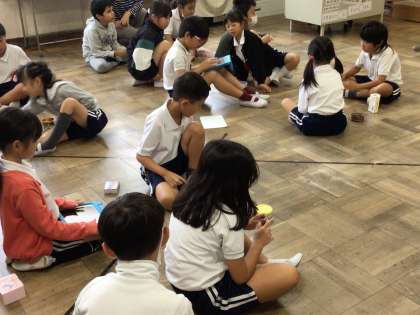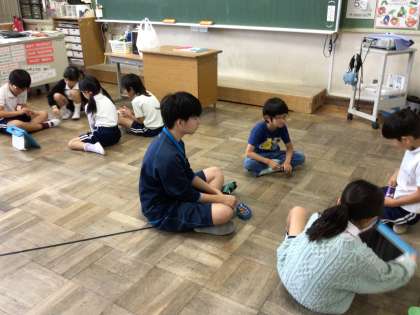 10/29 2年生 生活科 公開日 2024/10/29 更新日 2024/10/29 各学年から 2年生の生活科では、明日のどんぐりごま大会の練習をしました。グループごとにタイムをはかって、長い時間回せるように練習しました。今日から3日間、高橋中学校の生徒が職場体験学習に来ています。子どもたちと一緒に、学習の補助をしたり、遊んだりしてくれています。