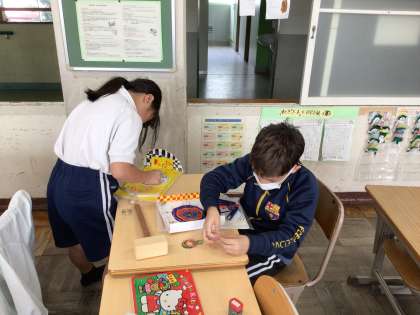 金槌を使って板に釘を打ち込み、迷路ゲームやダーツゲームなを製作しています。小さな釘を使って、玉が転がる道を作ります。出来上がりが楽しみですね。