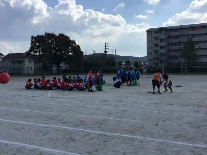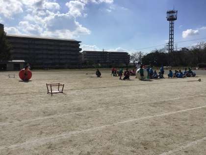 1、2年生体育「やまびこフェスティバル」の練習 ボール運び