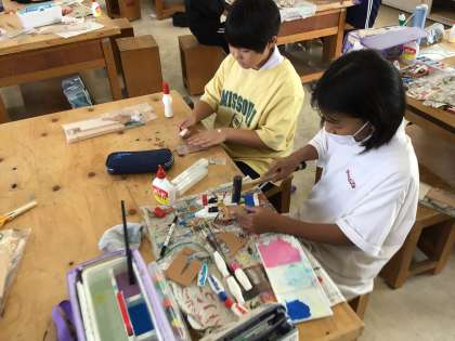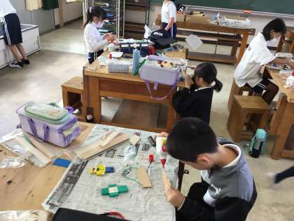 11/6 4年図工 公開日 2024/11/06 更新日 2024/11/06 各学年から 4年図工では、「ギコギコトントンクリエイター」の作品作りをしていました。木片に錐で穴をあけたり、着色したりとそれぞれで工夫をしながら作品作りを進めていました。