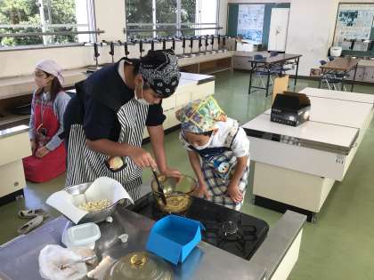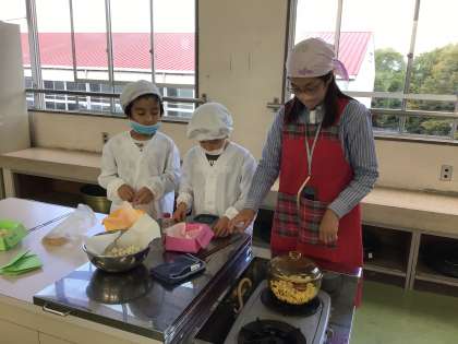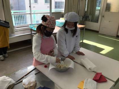 出来上がったポップコーンに味つけをします。塩味とキャラメル味、どちらが好きかな?
