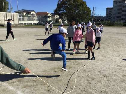 今日はやまびこ遊びの日です。今日は大縄跳びの練習を始めて行いました。少し風のある中でしたが8の字跳びを練習しました。これから何回か練習する機会があるのでがんばりましょう。