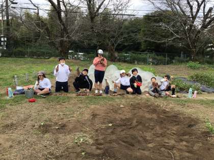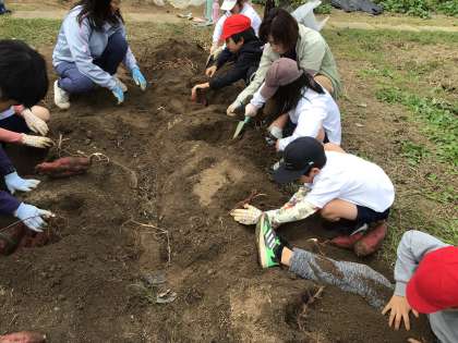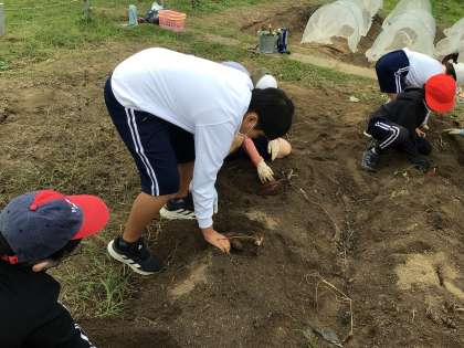サツマイモを掘っている様子です。大きなサイズのものが多くて、収穫後教室まで運ぶのが大変でした。