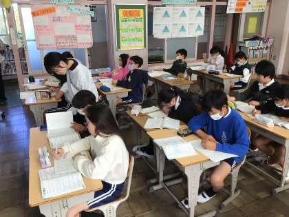 5年算数では、小数を分数に直したり、分数を小数に直したりすることを学んでいます。教科書のたしかめのページを黙々と解いていました。数の大小比較で大切になるので、しっかりと復習をしていきましょう。