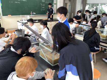 6年理科では、土地のつくりと変化という単元を学習しています。実験と並行して堆積岩の標本を観察していました。実際に手に取り、手触りなどを確かめながら感想や意見を述べていました。