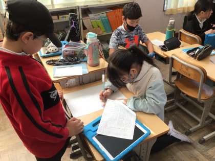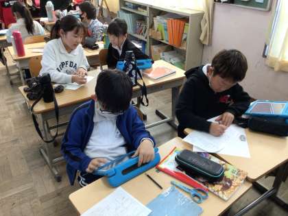 11/13 4年生国語 公開日 2024/11/13 更新日 2024/11/13 各学年から 和と洋の文化を比べる「和と洋新聞」の下書きをしています。班ごとに分担し、自分の担当の内容を読み手に分かるように記事に書きます。下書きができたら先生に確認してもらいます。
