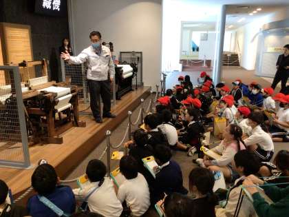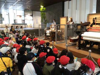4年生はバスに乗って、トヨタ鞍ヶ池記念館の見学にやって来ました。目の前で自動織機が動く様子を見せていただきました。子ども達は、想像以上の音の大きさに少し驚いたようでした。