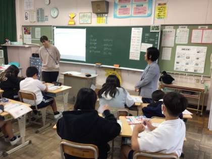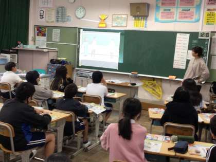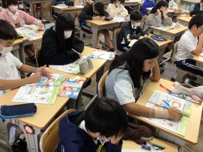 6年外国語では、2つの文字で表す音に親しもうのページでchで始まる単語について発音を確認していました。そn後、ユニット6に入り、リスニングに集中していました。