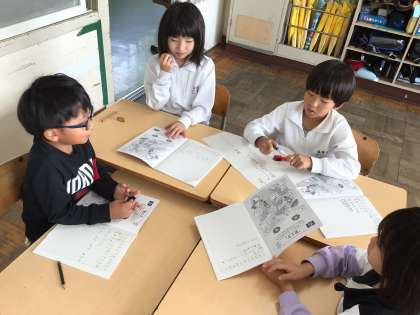 2年算数では、「なんこのいくつ分でしきをあらわそう」というめあてで学習を進めていました。問題を個人で考えた後、班で解き方を共有していました。