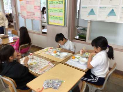 今日の献立は子どもたちの大好きなカレーライスです。友達と楽しく会話をしながら会食をしていました。
