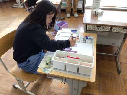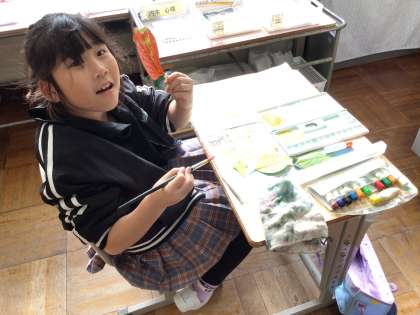 8組図工では、さつまいもの絵を描いたり、落ち葉で絵を描いたりしました。さつまいもの色は、とても上手に表現することができました。
