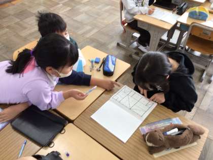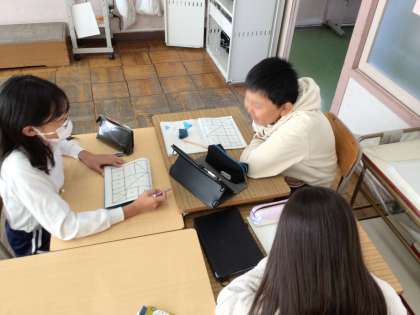 5年算数では、長方形、正方形、三角形の面積の求め方を復習をした後、「スプラトゥーンゲームの勝敗をつけよう」というめあてで学習を進めていました。班で面積の求め方を話し合っていました。