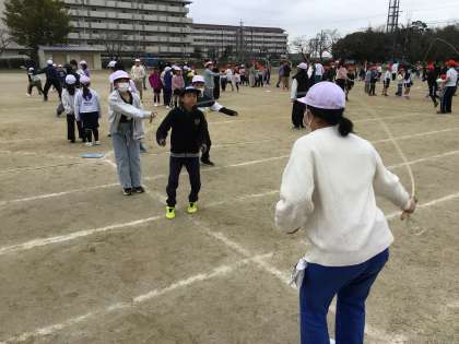 大縄練習の様子です。縄をよく見てタイミングよく跳ぶことができたかな?