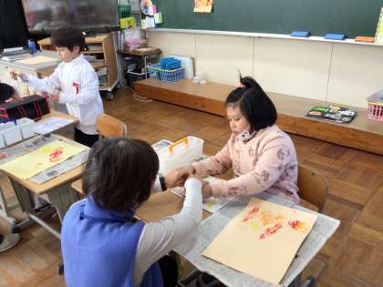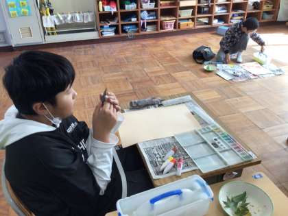 11/25 8組図工 公開日 2024/11/25 更新日 2024/11/25 各学年から 8組の図工では、秋の落ち葉を使って絵に表現しました。絵の具で葉に色をつけ、画用紙にスタンプのように押して色をつけ、絵を完成させました。