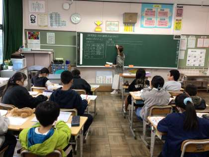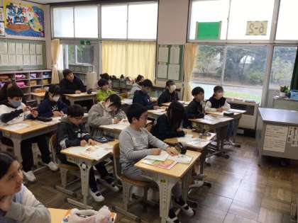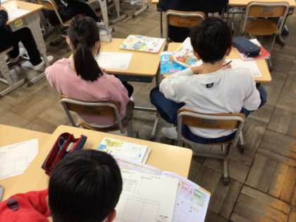 6年家庭科では、調理実習の準備をしています。粉ふきいもを作るようで、調理の手順を説明しながらワークシートに記入をしていました。