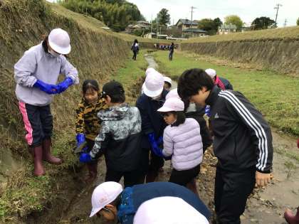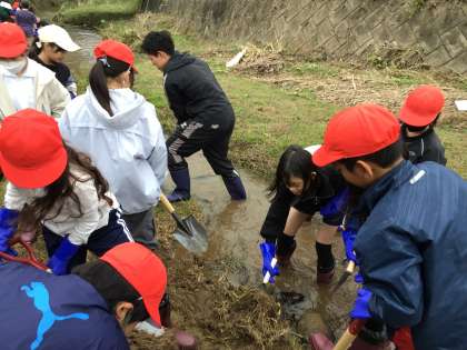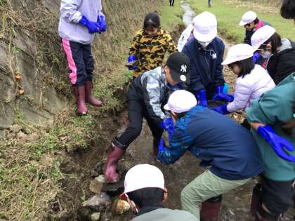 岩本川創遊会や矢作川研究所の協力のもと、岩本川の土を削ったり、岩を置き換えたりすることで、岩本川に生息する生物にとってよりよい環境することを目的に活動をしました。