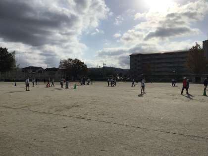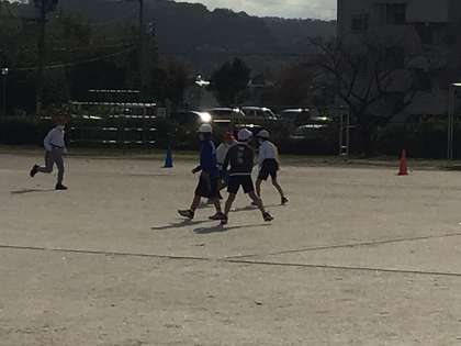6年体育では、1・2組合同で運動場で実施していました。タグラグビーの導入としてしっぽ取りを行っていました。元気よく走り回る姿が印象的でした。