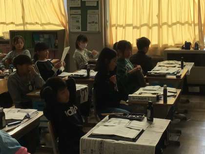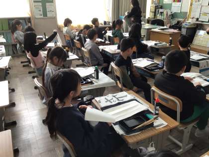 3年生書写では、初めて長い用紙に書く練習をしました。本番は紙は折りませんが、今日は、紙を折って、「山ざくら」を手本をよく見て書きました。書写ボランティアの方も来ていただき、手伝っていただきました。