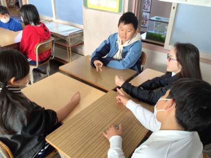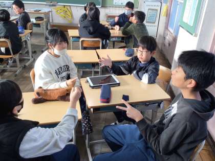 11/29 えがおタイム4 公開日 2024/11/29 更新日 2024/11/29 各学年から 「アドジャン!」のかけ声で、指の数の合計で、お題の表にある質問に答えていました。どの学級も楽しく進めていました。