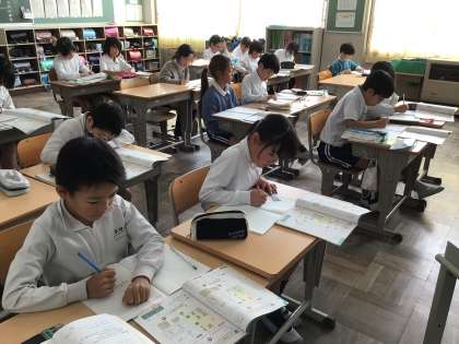かけ算の筆算の学習です。取り組む問題を先生が確認し、タイマーを押すとみんな集中して筆算の問題を解き始めました。計算の順番に気をつけて計算していました。九九を覚えている子はすらすらと解くことができますね。