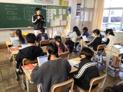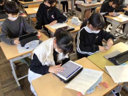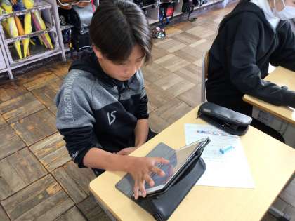 6年国語では、卒業文集作りを始めています。ワークシートにまとめたものをもとに、タブレット上の原稿用紙に入力を始めていきます。先生の指示を聞きながらタブレットを操作していました。