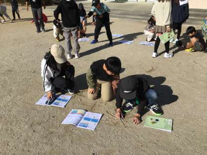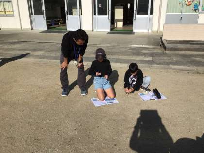 12/4 3年生理科 公開日 2024/12/04 更新日 2024/12/04 各学年から 「地面のようすと太陽」の学習です。一日の太陽の動きを調べるために、1時間ごとに太陽の位置を確認しています。方位磁針を使って、方角を確認しながら「さっきより、西に動いている」と太陽の動き意欲的に調べていました。