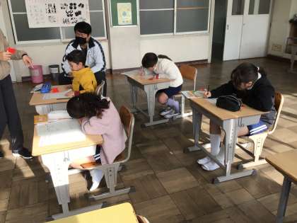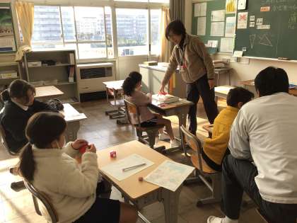 2年生算数、国際学級では、「三角形の直角を見つける」学習をしました折り紙で直角を作り、自分の持ち物や教室内のもので直角の部分をしらべました。