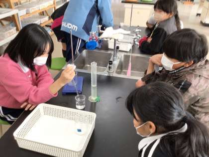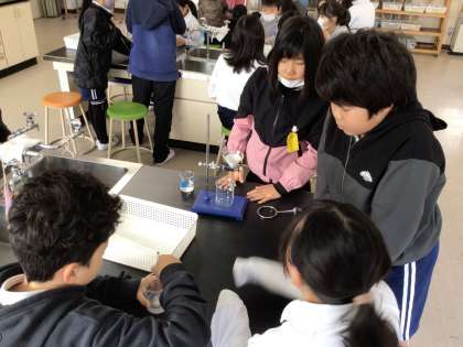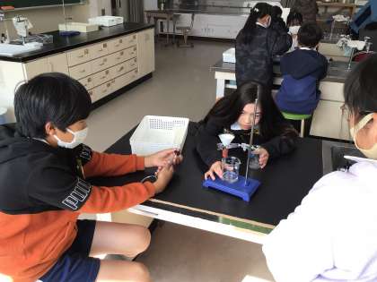 5年理科では、「水とミョウバンを分ける方法を考えよう」というめあてで学習を進めていました。はじめに実験の説明を聞いた後、グループで協力をして実験を行っていました。漏斗などの液体の様子を真剣に観察をしていました。