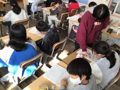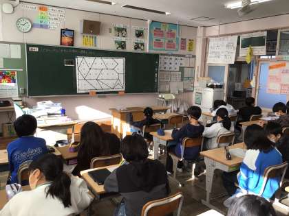 5年算数では、「スプラトゥーンゲームの勝敗をつけよう」というめあてで学習を進めていました。正方形、長方形、三角形、平行四辺形など面積の求め方を学んでいます。それを踏まえて図を見ながら夢中になって解いていました。