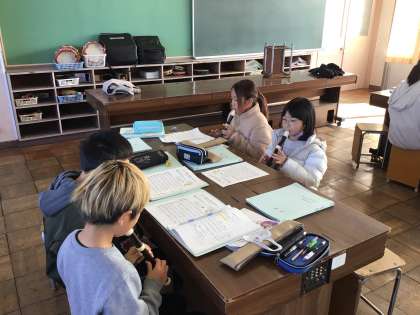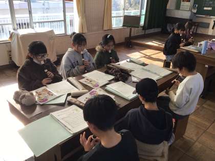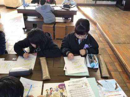 4年音楽のリコーダー練習と授業の振り返りを記入している様子です。
