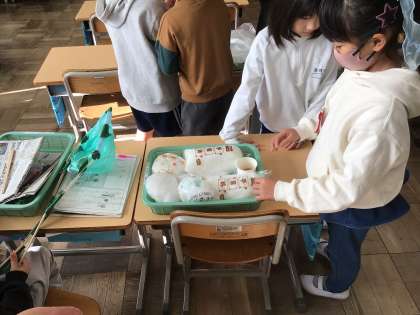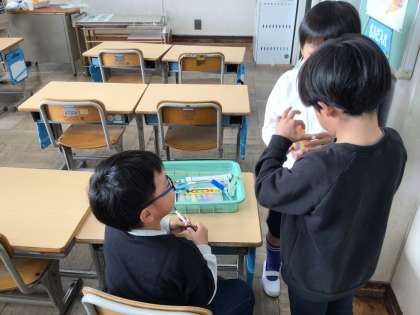 2年生の生活科では、1年生との「おもちゃ祭り」に向けて、準備をしています。今日は最終の準備で、グループごとに材料の確認をしたり、説明の練習をしたり看板の作成をしたりしました。
