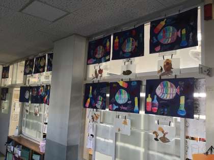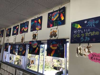 1年生の図工では「世界に一つだけの海」の絵を作成しました。1年生の廊下に掲示してあります。初めて絵の具を使い、楽しみながら描くことができました。個別懇談会の時にぜひご覧ください。