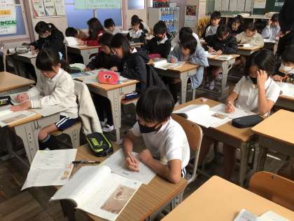 「ごんぎつね」の学習です。プリントに物語のキーワードを入れながら、物語のあらすじを捉えました。物語のあらすじが分かった子ども達の中には、「ごんはただのいたずらぎつねだと思っていたけれど、本当はいいきつねなのかもしれない」とごんに対する思いが変わった子どももいます。さあ、ごんはどんなきつねなのでしょうか。これから詳しく読み進めていくのが楽しみですね。