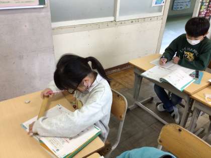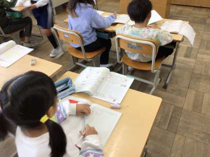 2年生算数では「三角形、四角形」や「九九」の学習をしています。今日は、教科書の練習問題や問題集などを使って復習しました。