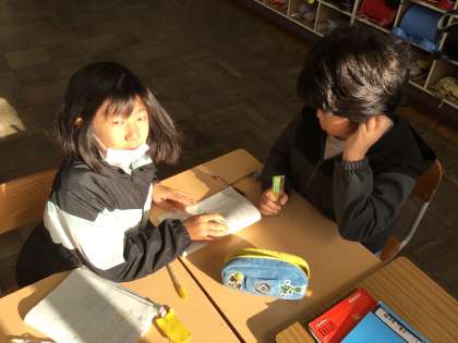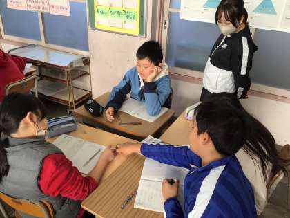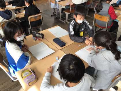 5年算数では、「平均から全体の量を求めよう」というめあてで学習を進めていました。前時の復習を行った後、班で問題を説明できるように話し合っていました。