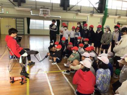 パラアスリートの方に来ていただき、特別授業をしていただきました。義足のつけ方や外れない仕組を詳しく教えていただきました。実際に義足をつける様子も見せていただき、子ども達にとって貴重な機会となりました。