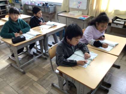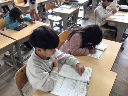 2年生算数では、「三角形、四角形」の学習をしています。算数の友を使って復習しました。国際学級では、算数のテストをしました。