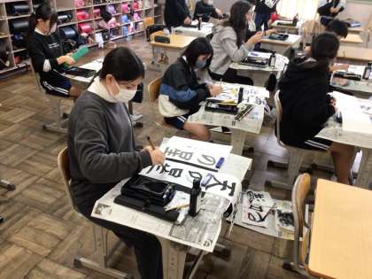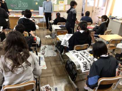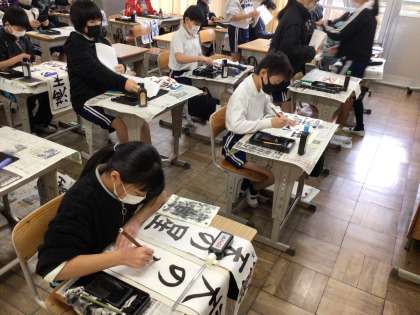 12/16 6年書写 公開日 2024/12/16 更新日 2024/12/16 各学年から 6年書写では、豊田書写連盟の先生方に来校していただき、ご指導いただきました。「満天の星」は画数が多いので難しいけれど、がんばって書いていました。
