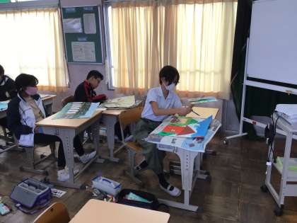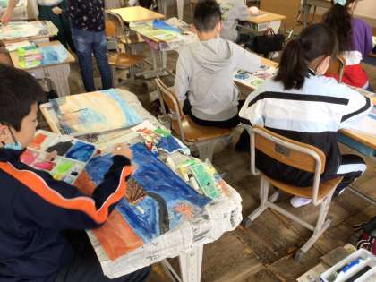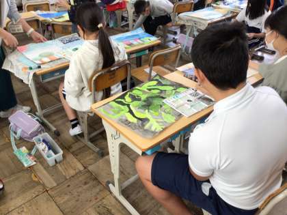 5年生は図工で「まだ見ぬ世界」の学習で、心にとまった写真から、想像して絵を描きました。今日は、絵の具で背景を塗りました。きれいな色を作って塗ることができました。
